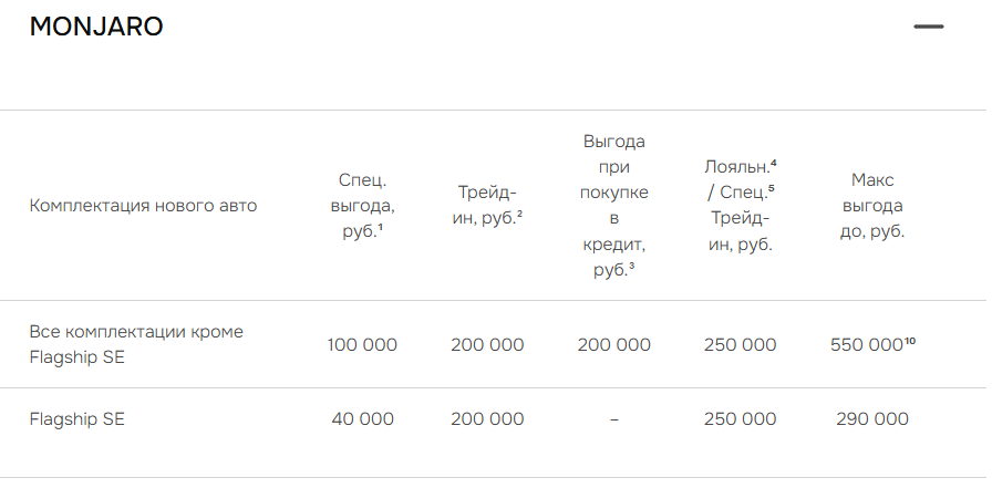 ¹⁰ Выгода в размере 550 000 рублей указана для автомобилей «Geely Monjaro» (все комплектации), и состоит из специальной выгоды в размере 100 000 рублей, выгоды при покупке в кредит в размере 200 000 рулей и выгоды по программе «Лояльный/Специальный Трейд-ин» в размере 250 000 рублей. Программа действительна с 01.02.2026 г. по 28.02.2026 г.