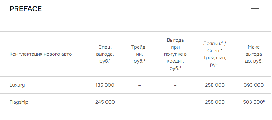⁶ 6 Выгода в размере 503 000 рублей указана для автомобилей «Geely Preface» (комплектация Flagship), и состоит из специальной выгоды в размере 245 000 рублей и выгоды по программе «Лояльный/Специальный Трейд-ин» в размере 258 000 рублей. Программа действительна с 01.02.2026 г. по 28.02.2026 г.