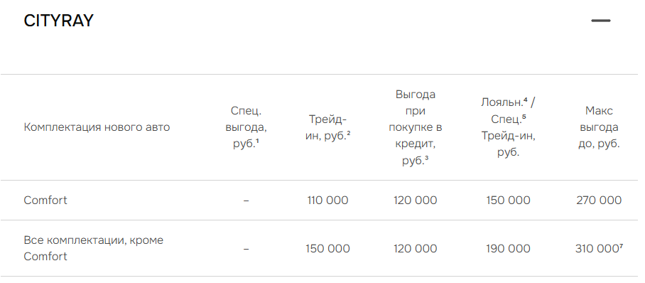 ⁷ Выгода в размере 310 000 рублей указана для автомобилей «Geely Cityray» (все комплектации, кроме Comfort), и состоит из выгоды по покупке в кредит в размере 120 000 рублей и выгоды по программе «Лояльный/Специальный Трейд-ин» в размере 190 000 рублей. Программа действительна с 01.02.2026 г. по 28.02.2026 г.